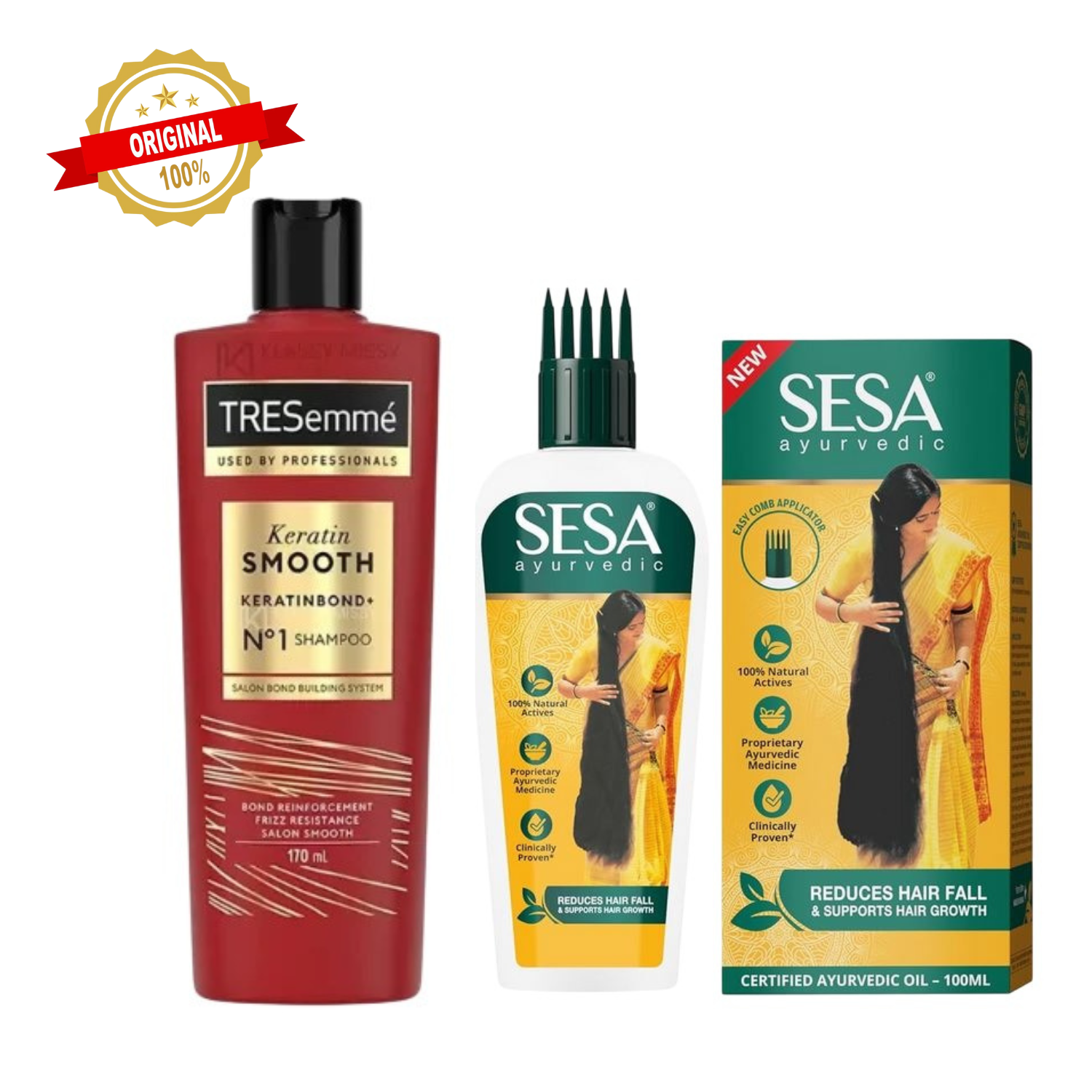 Tresema Shampoo gently removes dirt and impurities while keeping your hair moisturized, and Sesa Hair Oil strengthens your roots with Ayurvedic ingredients for visible improvement in hair health.